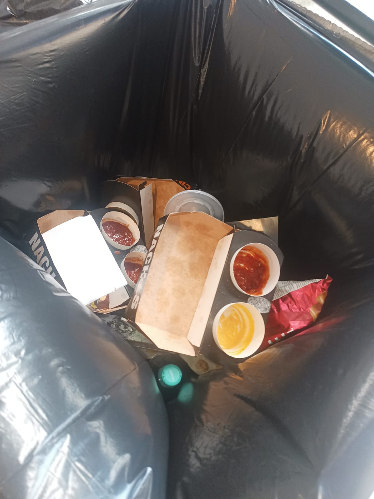 Contains objects: cardboard household waste, clear PP cup, food waste, plastic bottle cap, plastic pouch