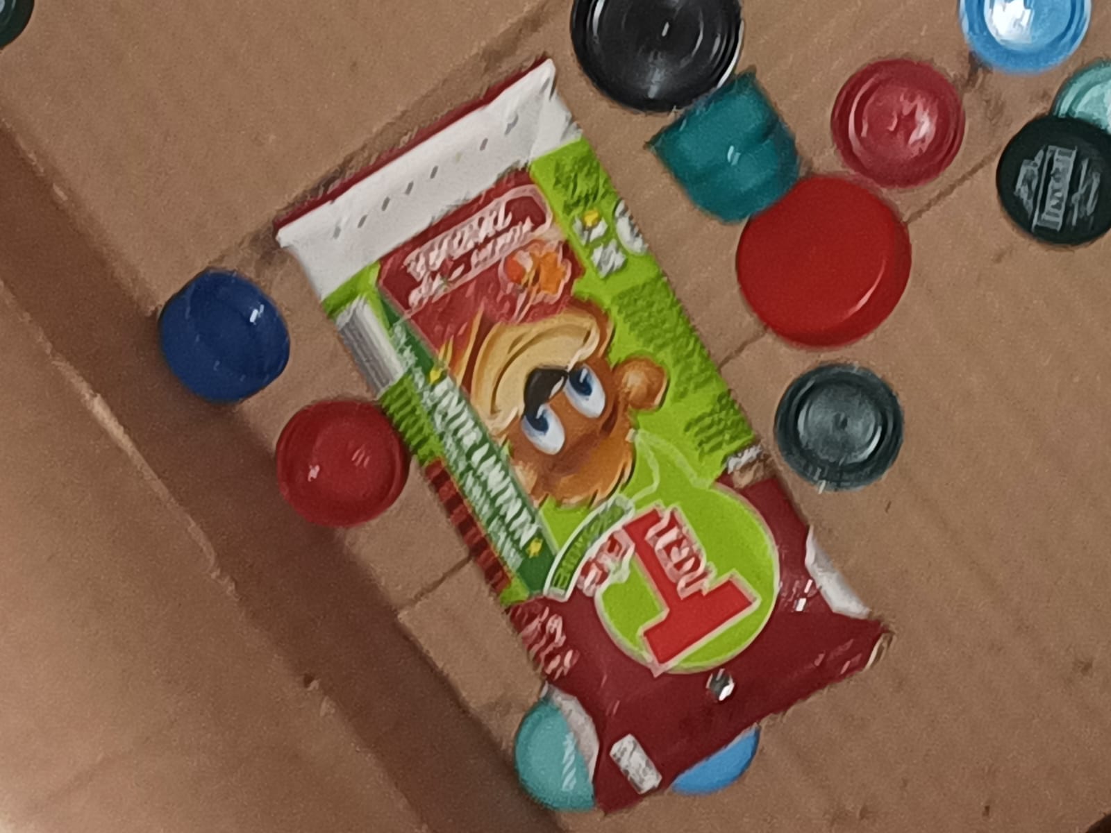 Contains objects: drink carton, plastic bottle cap